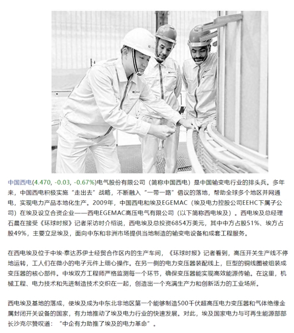 中國(guó)西電電氣股份有限公司(簡(jiǎn)稱(chēng)中國(guó)西電)是中國(guó)輸變電行業(yè)的排頭兵。多年來(lái),中國(guó)西電積極實(shí)施“走出去”戰(zhàn)略,不斷融入“一帶一路”倡議的落地,幫助全球多個(gè)地區(qū)并網(wǎng)通電,實(shí)現(xiàn)電力產(chǎn)品本地化生產(chǎn)。2009年,中國(guó)西電和埃及EGEMAC(埃及電力控股公司EEHC下屬子公司)在埃及設(shè)立合資企業(yè)——西電EGEMAC高壓電氣有限公司(以下簡(jiǎn)稱(chēng)西電埃及)。西電埃及總經(jīng)理石晨在接受《環(huán)球時(shí)報(bào)》記者采訪(fǎng)時(shí)介紹說(shuō),西電埃及總投資6854萬(wàn)美元,其中中方占股51%、埃方占股49%,主要立足埃及,面向中東和非洲市場(chǎng)提供當(dāng)?shù)刂圃斓妮斪冸娫O(shè)備和成套工程服務(wù)。
